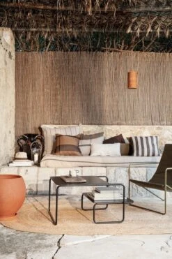 ferm LIVINGin Desert-tyyny elävöittää sisustusta ja hyödyntää näppärästi kulutuksesta jäänyttä muovia. Kierrätetystä PET-langasta käsintehty tyyny on täysin mukautettu ulkokäyttöön, mutta tuntuu villamaisen pehmeältä käytössä. Kapea tyyny sopii yhteen Desert Lounge Chairin kanssa tai koristaa mainiosti esimerkiksi olohuoneen tai parvekkeen sohvaa.