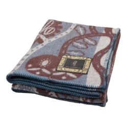 Kaunisteen Tuisku-villahuopaa koristaa abstrakti, talvinen kuosi, joka toistuu huovan toisella puolella vastakkaisissa sävyissä.