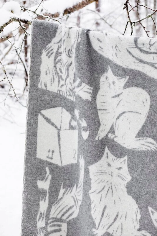 Lapuan Kankureiden Kissanpäivät-huovassa seikkailevat kuvittaja Matti Pikkujämsän luomat viehkeän kauniit kissaeläimet. Seesteinen värimaailma antaa huovalle selkeän, graafisen ilmeen, ja suloinen kuvio toistuu viltin toisella puolella vastakkaisissa sävyissä. Pehmeä huopa lämmittää talvipakkasilla ja on ihana kietaista ylle myös viilenevinä kesäiltoina – ja kelpaapa viltin alla lekotella sohvalla täydellisesti rentoutuneena, aivan kuin olisi kissanpäiviä viettämässä itsekin! Huopa on valmistettu mulesing-vapaasta uusiseelantilaisesta villasta Liettuassa sijaitsevalla ompelimolla.