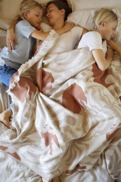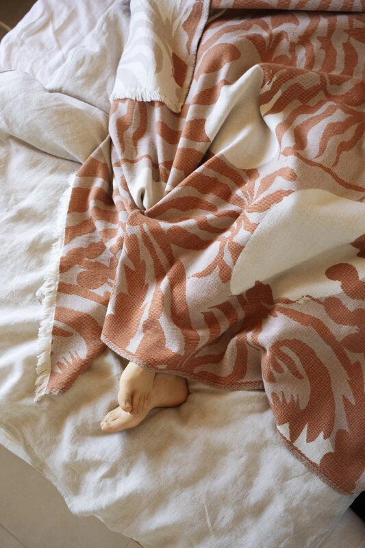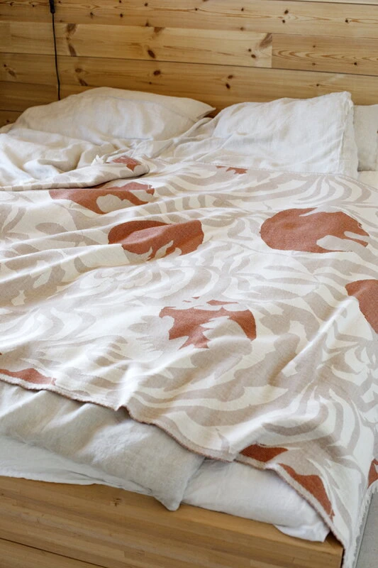 Lapuan Kankureiden Kuutamo-huopa on valmistettu merinovillan ja puuvillan sekoituksesta, joka tuntuu ihanan ylelliseltä ihoa vasten. Pehmeää vilttiä koristavaa kuviota ovat inspiroineet loppukesän trooppiset yöt, jolloin metsän kasvusto siivilöi kuun kelmeää valoa. Saara Obelen suunnittelema kuosi yhdistettynä unelmanpehmeään materiaaliin takaa, että suloinen viltti toimii syysiltojen takuuvarmana lämmittäjänä. Sopiipa se myös kesäpäiviin: nappaa huopa mukaan puistoon kauniiksi piknikviltiksi!