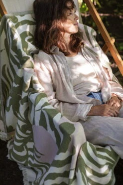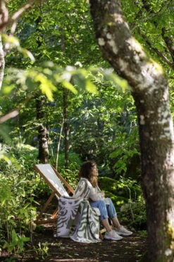 Lapuan Kankureiden Kuutamo-huopa on valmistettu merinovillan ja puuvillan sekoituksesta, joka tuntuu ihanan ylelliseltä ihoa vasten. Pehmeää vilttiä koristavaa kuviota ovat inspiroineet loppukesän trooppiset yöt, jolloin metsän kasvusto siivilöi kuun kelmeää valoa. Saara Obelen suunnittelema kuosi yhdistettynä unelmanpehmeään materiaaliin takaa, että suloinen viltti toimii syysiltojen takuuvarmana lämmittäjänä. Sopiipa se myös kesäpäiviin: nappaa huopa mukaan puistoon kauniiksi piknikviltiksi!