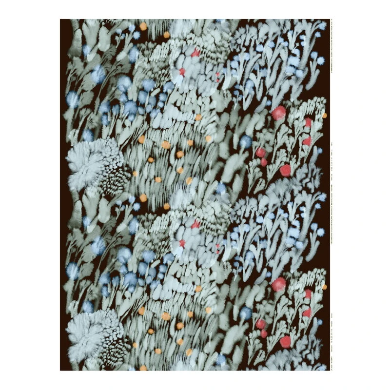 Marimekon Kuisma-pellavakangasta somistaa Aino-Maija Metsolan kaunis kuosi, jossa syksyn viimeiset kukat huojuvat hiljaa tuulessa ja lehdet ovat jo käpristyneitä. Kuvion utuinen ja tunnelmallinen ilme on saavutettu maalaamalla vesiväreillä märälle paperille.