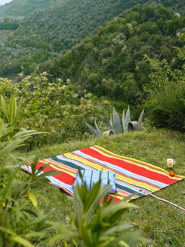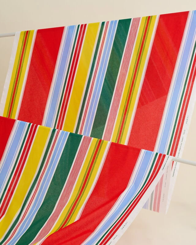 Marimekon puuvillakangasta koristaa Fujiwo Ishimoton suunnittelema, raidallinen Paraati-kuvio. Raidat ovat jo vuosikymmeniä olleet erottamaton osa Marimekon monipuolista kuviomaailmaa – monivärinen Paraati on Ishimoton raikas tulkinta niistä.