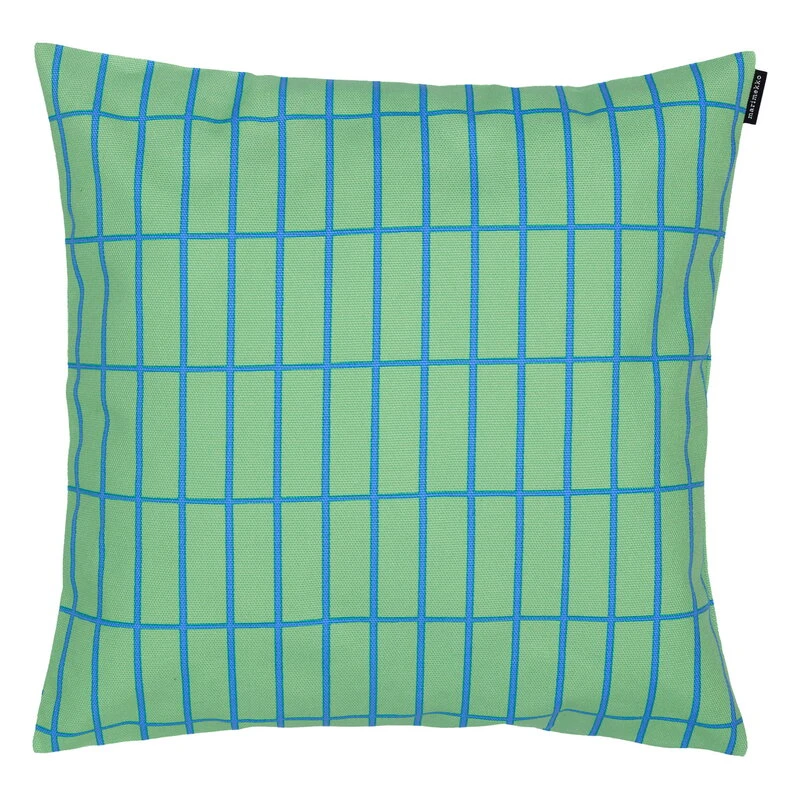 Tässä tyynynpäällisessä ajaton ruutukuvio on väritetty vaaleanvihreällä ja vaaleansinisellä. Huomaathan, että Marimekon tyynynpäälliset ommellaan koko kankaan leveydestä, ja niinpä niiden kuvion ja värien asettelu vaihtelee päällisestä toiseen.