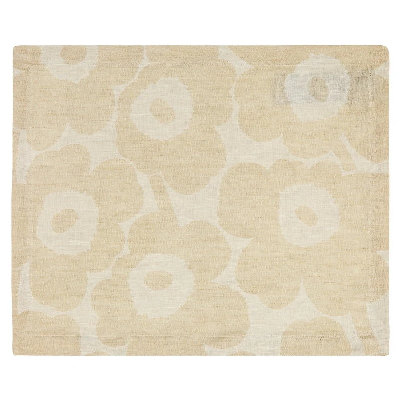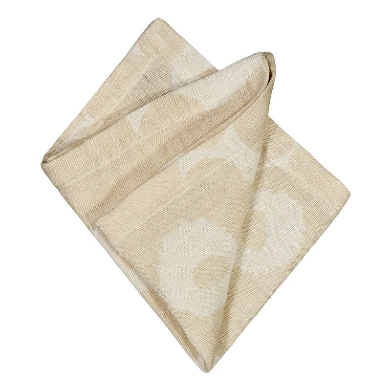 Marimekon Pieni Unikko -lautasliina viimeistelee juhlakattauksen. Puuvillapellavasta jacquard-neuloksella valmistettu kankainen lautasliina on kooltaan 42 x 42 cm.