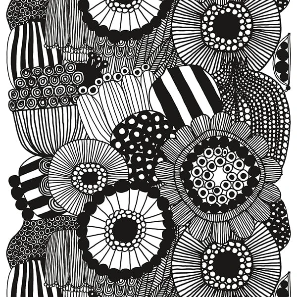 Marimekon Siirtolapuutarha-kankaassa on Maija Louekarin hyväntuulinen painokuosi, joka kuvaa kesän kukkaloistoa. Kuvion graafisuutta korostaa mustavalkoinen väripaletti. Kangas on valmistettu paksusta, sataprosenttisesta puuvillasta, ja sen raportin pituus on 116 cm.