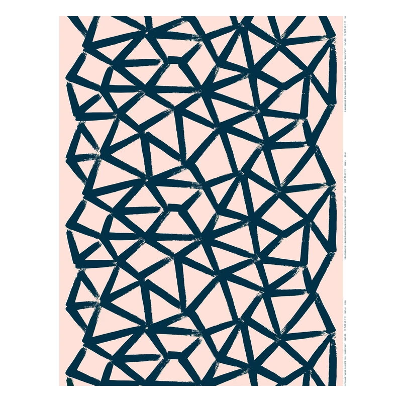 Eleganteilla persikan ja tummansinisen sävyillä viimeistelty puuvillakangas on painettu Helsingissä, ja se sopii mainiosti vaikkapa verhojen tai pöytäliinan ompeluun.