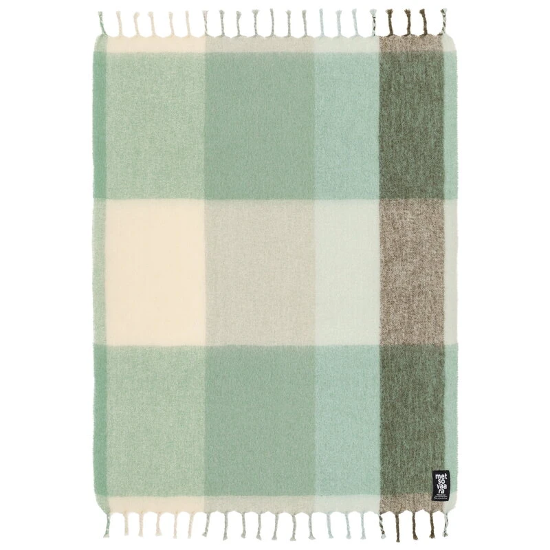 Metsovaaran Helmiäinen-huopa hurmaa merenalaisen maailman innoittamilla väreillään – sen ruudukosta voi löytää niin vihreää, ruskeaa ja harmaata kuin liilaan taittavaa valkoistakin. Hapsuilla koristellun huovan design on peräisin 1960-luvulta, ja se tuokin sisustukseen palasen kotimaisen tekstiilisuunnittelun historiaa.