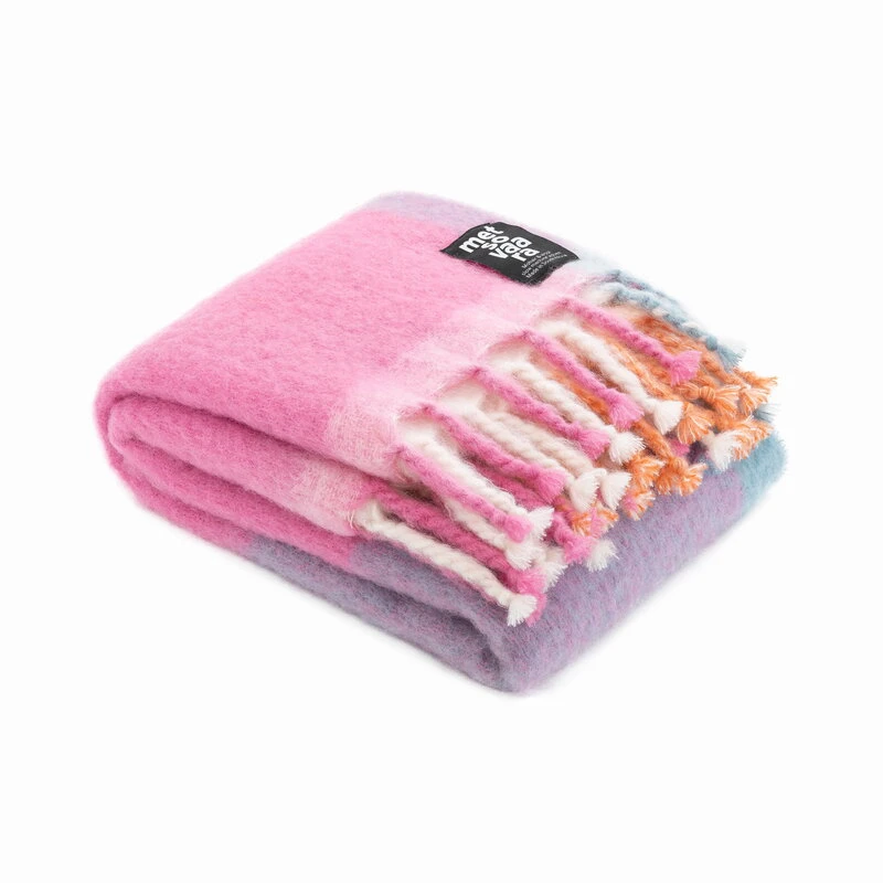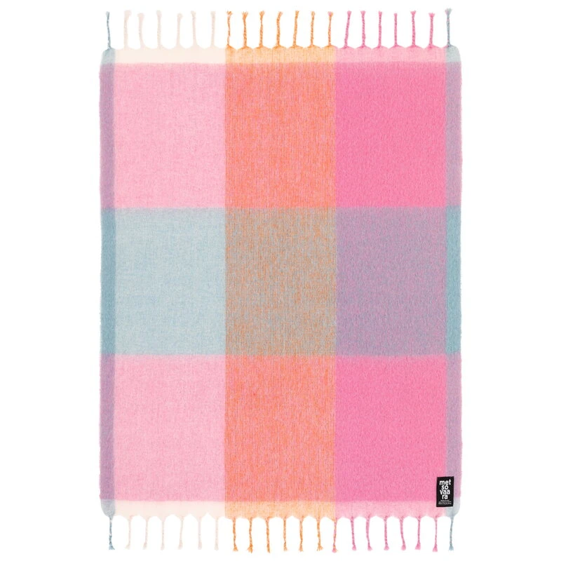 Metsovaaran Pinkki-huopa hurmaa herkullisilla pastelliväreillään – sen ruudukosta voi löytää niin sinistä, oranssia kuin tietysti vaaleanpunaistakin. Hapsuilla koristellun huovan design on peräisin 1960-luvulta, ja sen on suunnitellut tietysti Marjatta Metsovaara.