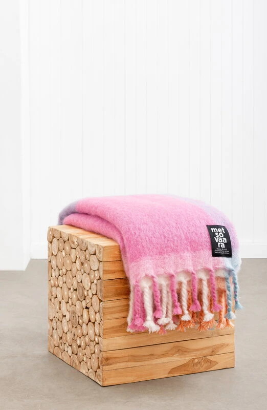 Mohairlangan ja villan yhdistelmästä valmistettu Pinkki-huopa on tehty Etelä-Afrikassa. Sen pinta on harjattu pörröiseksi, mikä antaa sille paitsi klassisen ja ylellisen ilmeen, myös ihanan pehmoisen tekstuurin. Lämpöiseen ja värikkääseen vilttiin kelpaa kääriytyä niin päivänokosilla kuin viileinä iltoina sohvannurkassa.