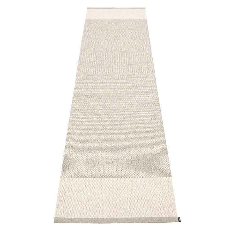 Pappelinan Edit-matto on kuvioitu kauniilla kolmisävyisellä kuosilla, jossa värit sekoittuvat keskenään eläväpintaiseksi, metallinhohteen sävyttämäksi kudelmaksi. Maton käännetyt päätyreunat on viimeistelty vahvoin ompelein tehdyillä päärmeillä, ja yhteen kulmaan on ommeltu kuminen Pappelina-logo. Edit-matto voidaan pestä käsin tai pesukoneessa.