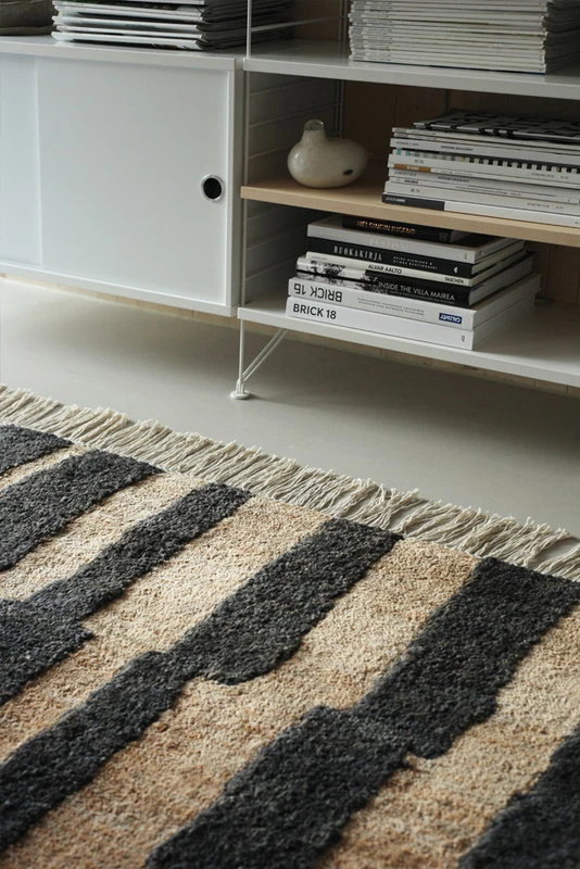 Roots Livingin Pilari-matto on Ulla Koskisen käsialaa ja kuuluu brändin Designer-kokoelmaan. Nukkapinnan korkeuksien vaihtelu korostaa hienosti maton graafista, epäsymmetristä kuviointia, jonka Koskinen on suunnitellut käsin piirtämällä. Harmaa-ruskealla kuviolla koristeltu Pilari-matto on valmistettu bambusta ja villasta, ja luonnolliset materiaalit tuovatkin kokonaisuuteen paitsi syvyyttä ja lempeyttä, myös kiinnostavaa tekstuuria. Matto on viimeistelty päätyhapsuilla.